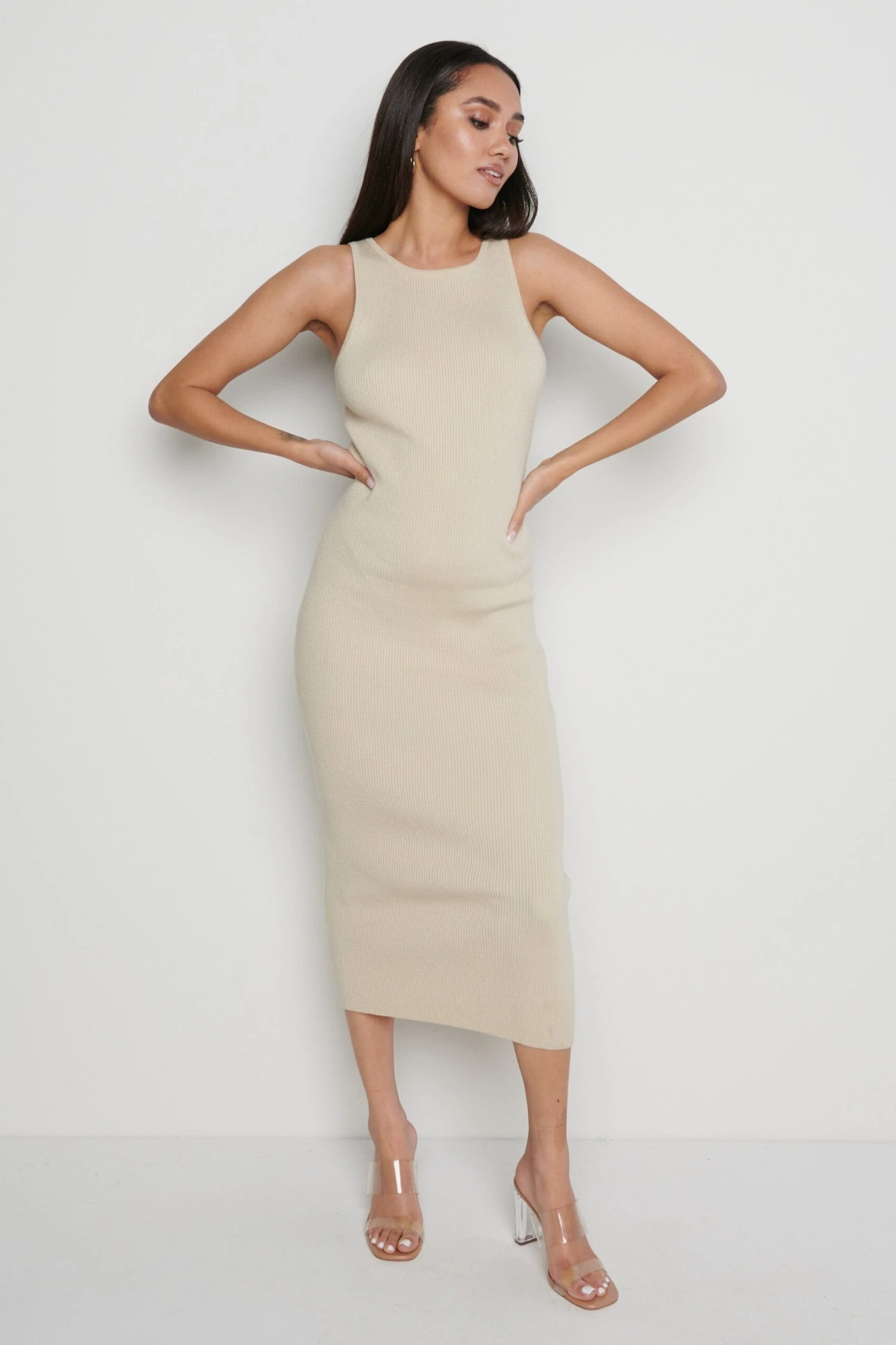 The Billie midi dress is made from a beige mid-weight knit fabric with a ribbed finish that feels soft against the skin. The racer silhouette is so on trend this season, style yours from dawn to dusk by swapping trainers to mules.