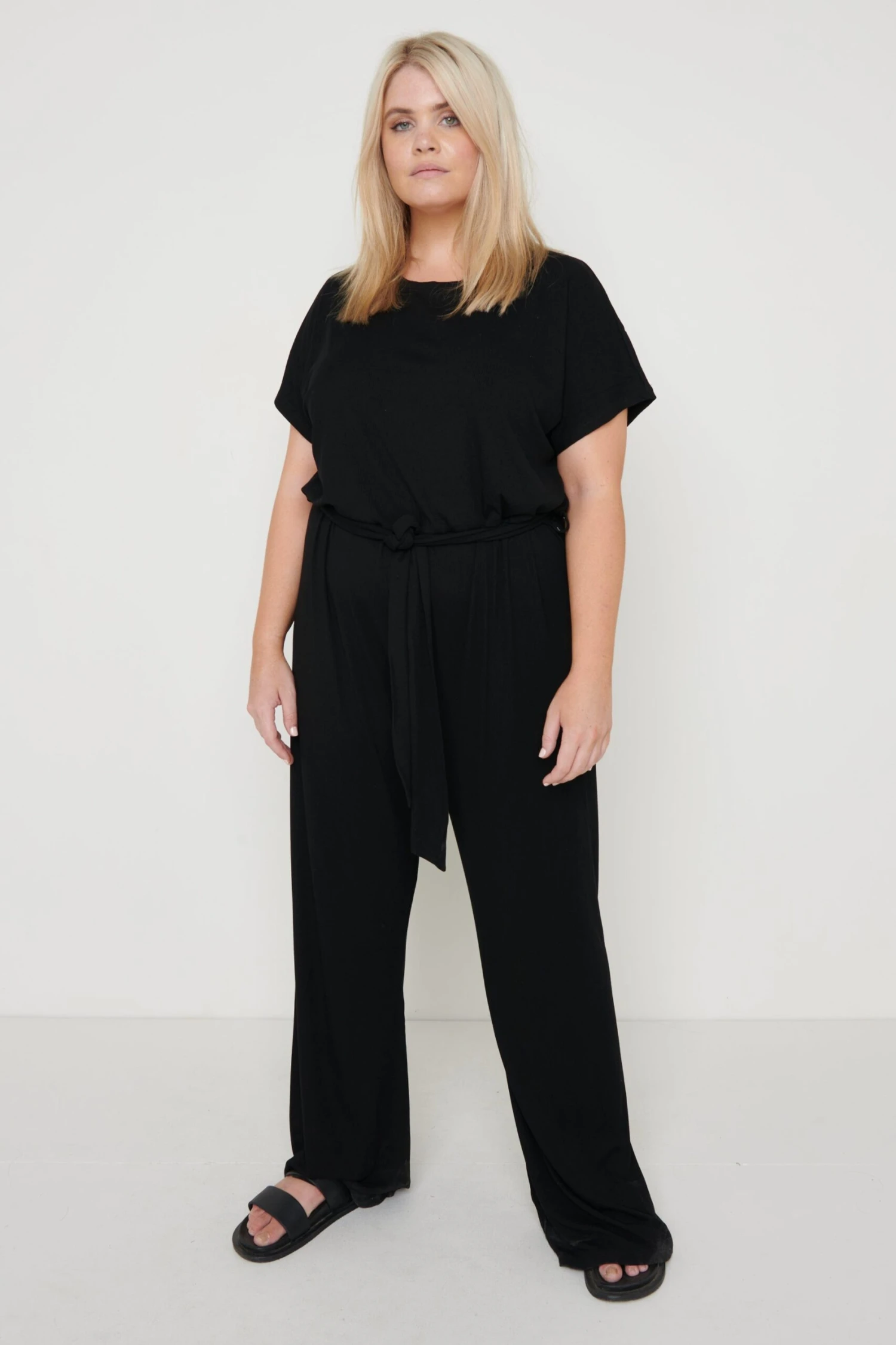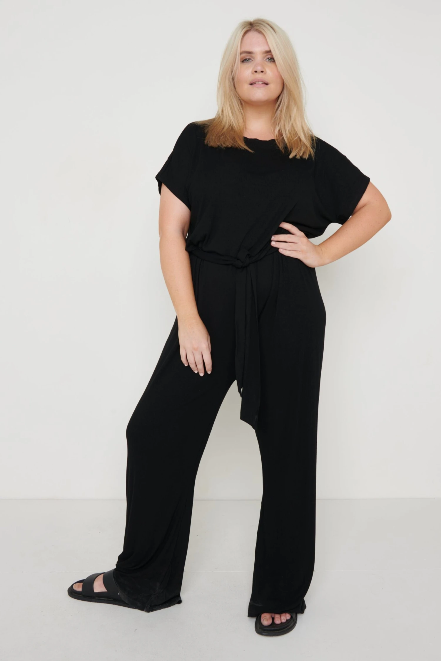 The Claude jumpsuit is the perfect choice if you want to look stylish whilst comfortable! Made from a black ribbed jersey fabric which feels super soft and light against the skin. The silhouette will accentuate your figure with a detachable tie at the waist and trousers that elegantly flare at the hem.
