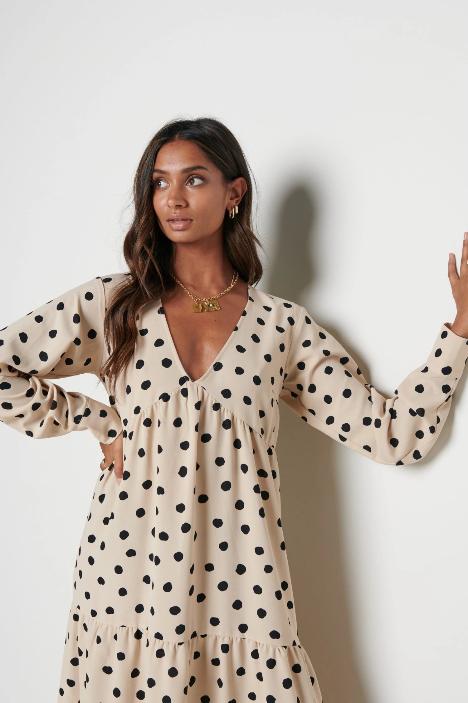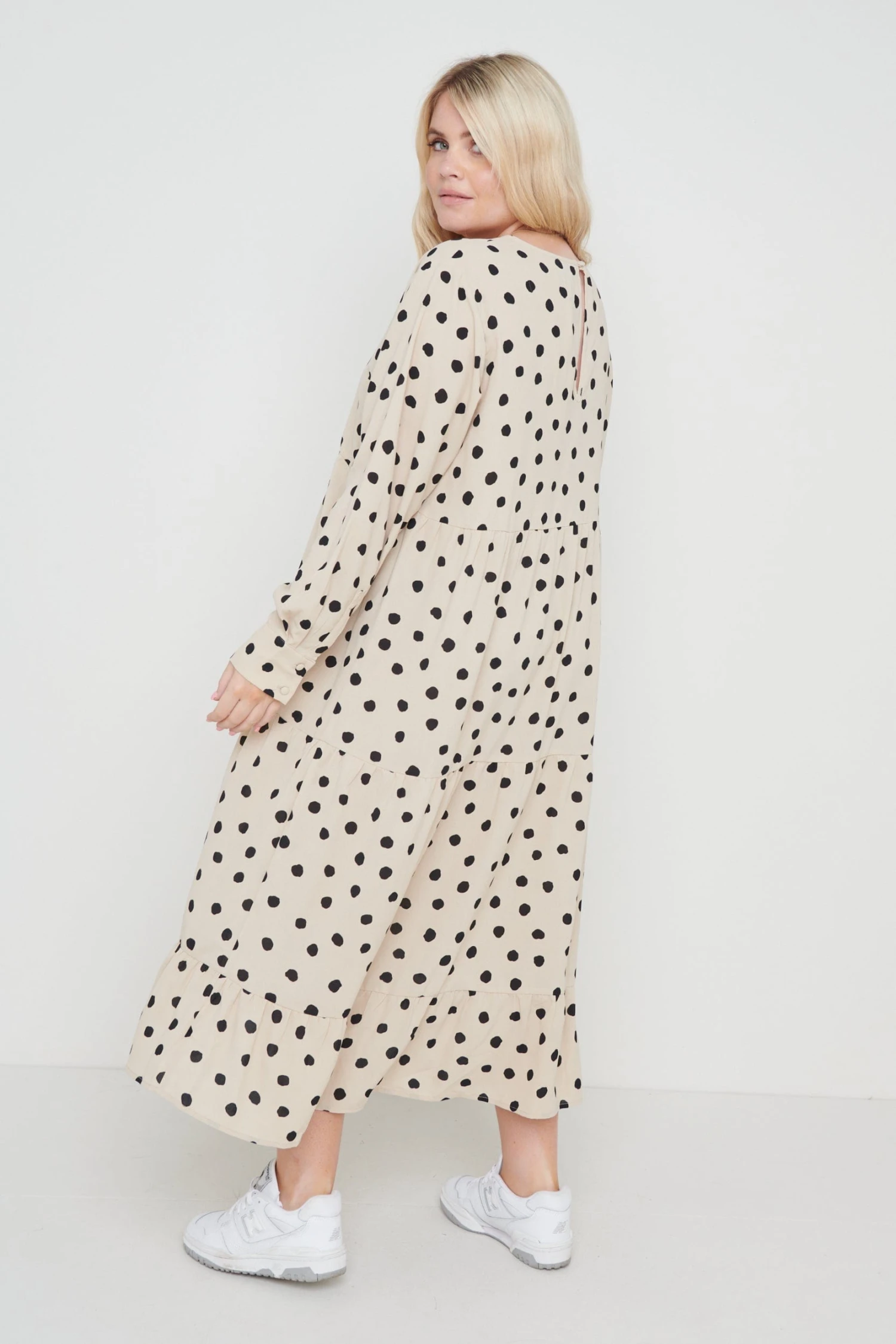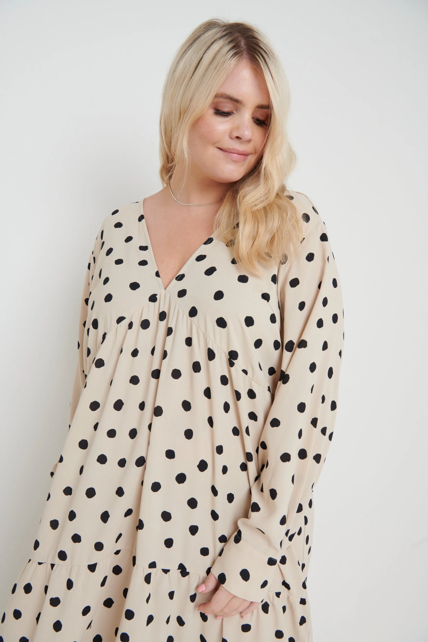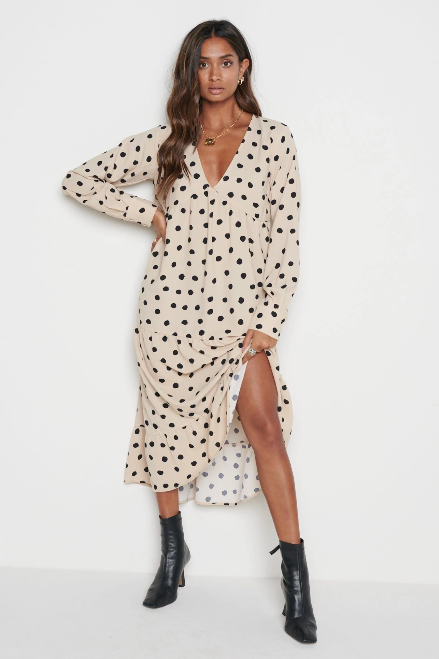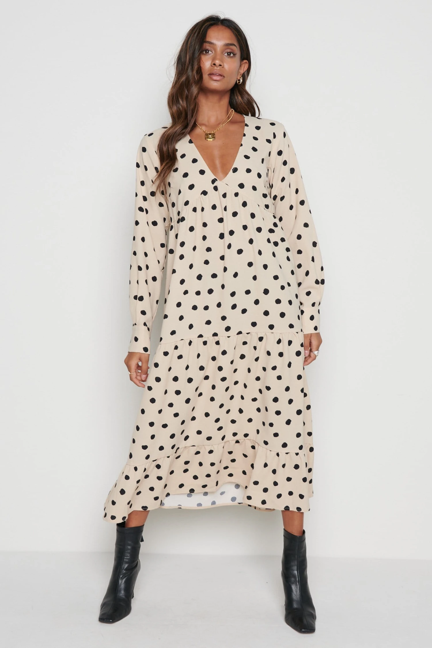 The Dotty day dress is cut from a woven polka dot print. Designed with under bust detailing, subtle balloon sleeves, tiered midi skirt and cuffs with button detailing. This dress will become a staple in your wardrobe and can be worn to work, lunch with friends and much more. Style yours with black heeled boots to take you from day to evening.