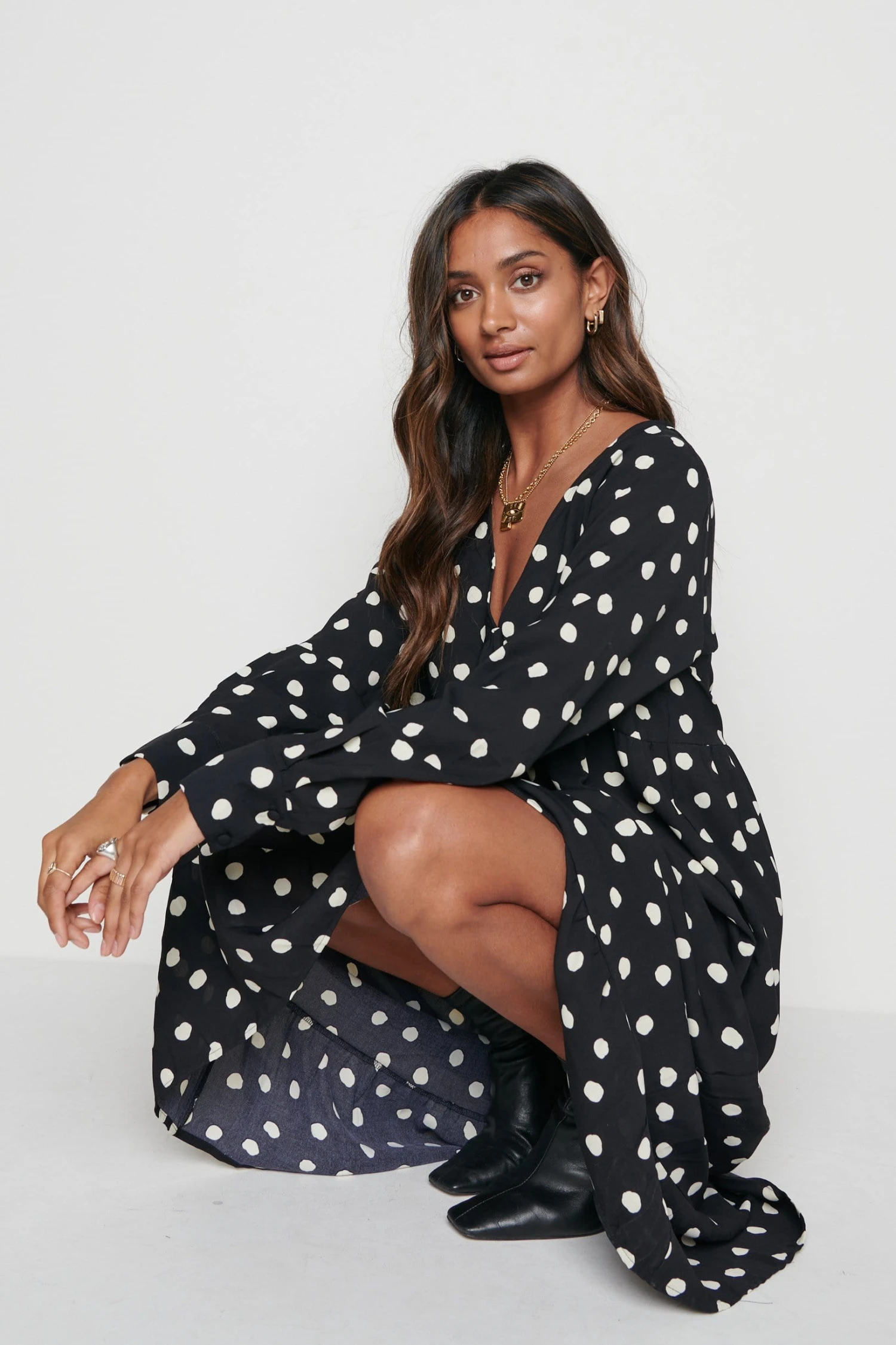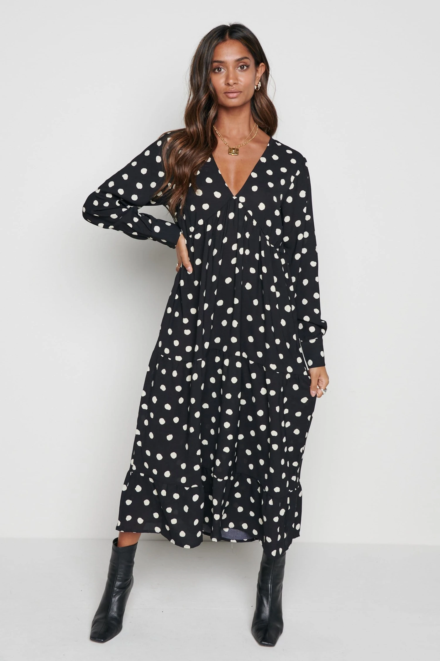 The Dotty day dress is cut from a woven polka dot print. Designed with under bust detailing, subtle balloon sleeves, tiered midi skirt and cuffs with button detailing. This dress will become a staple in your wardrobe and can be worn to work, lunch with friends and much more. Style yours with black heeled boots to take you from day to evening.