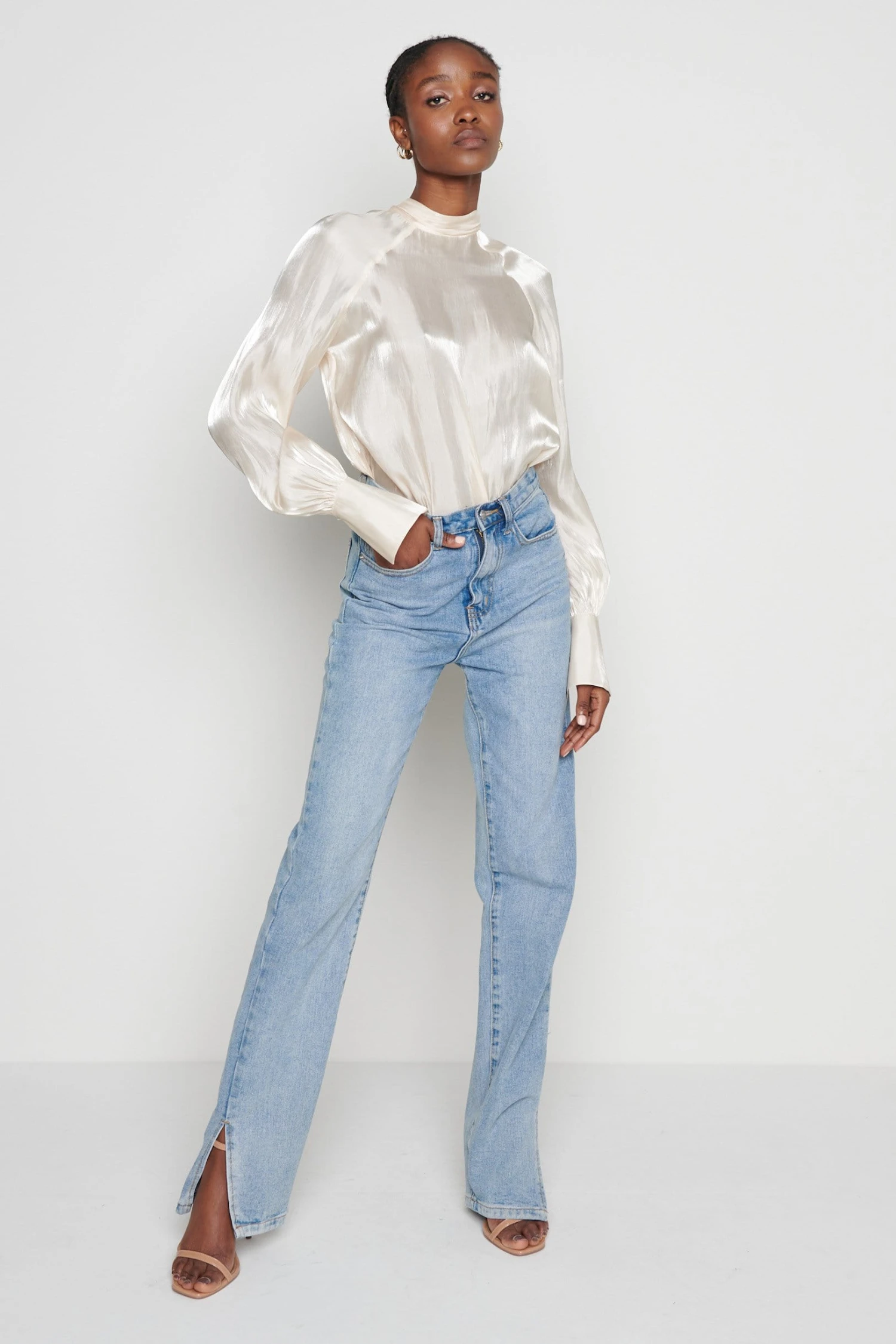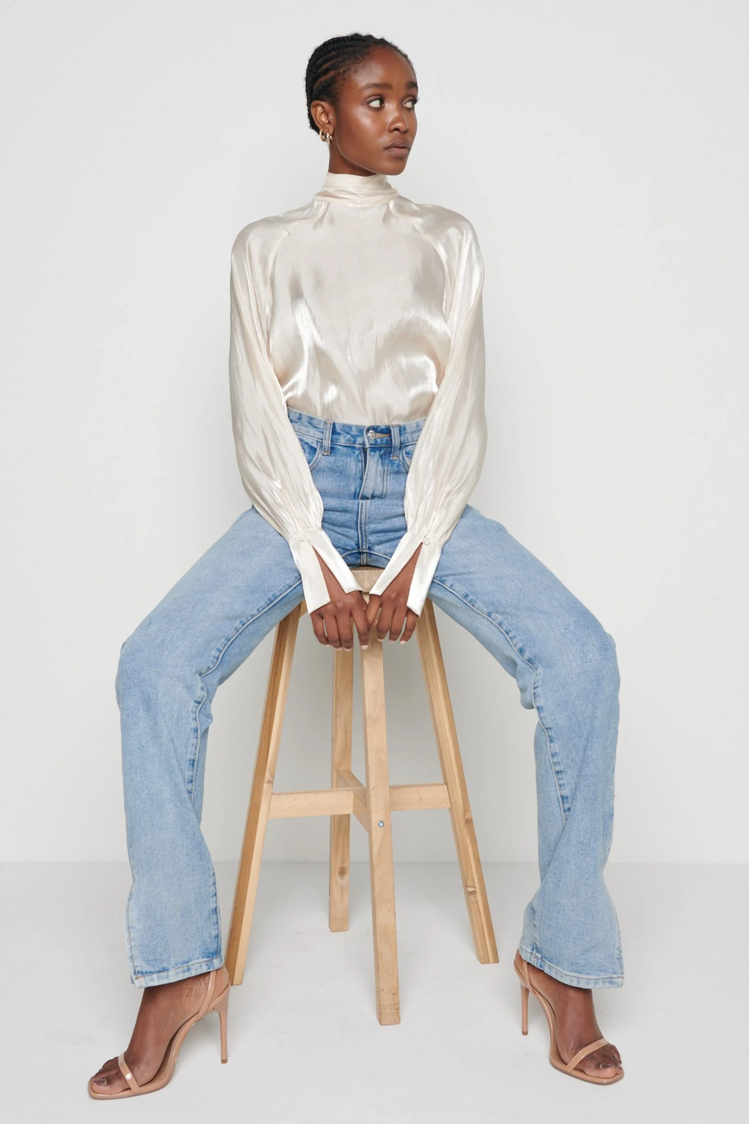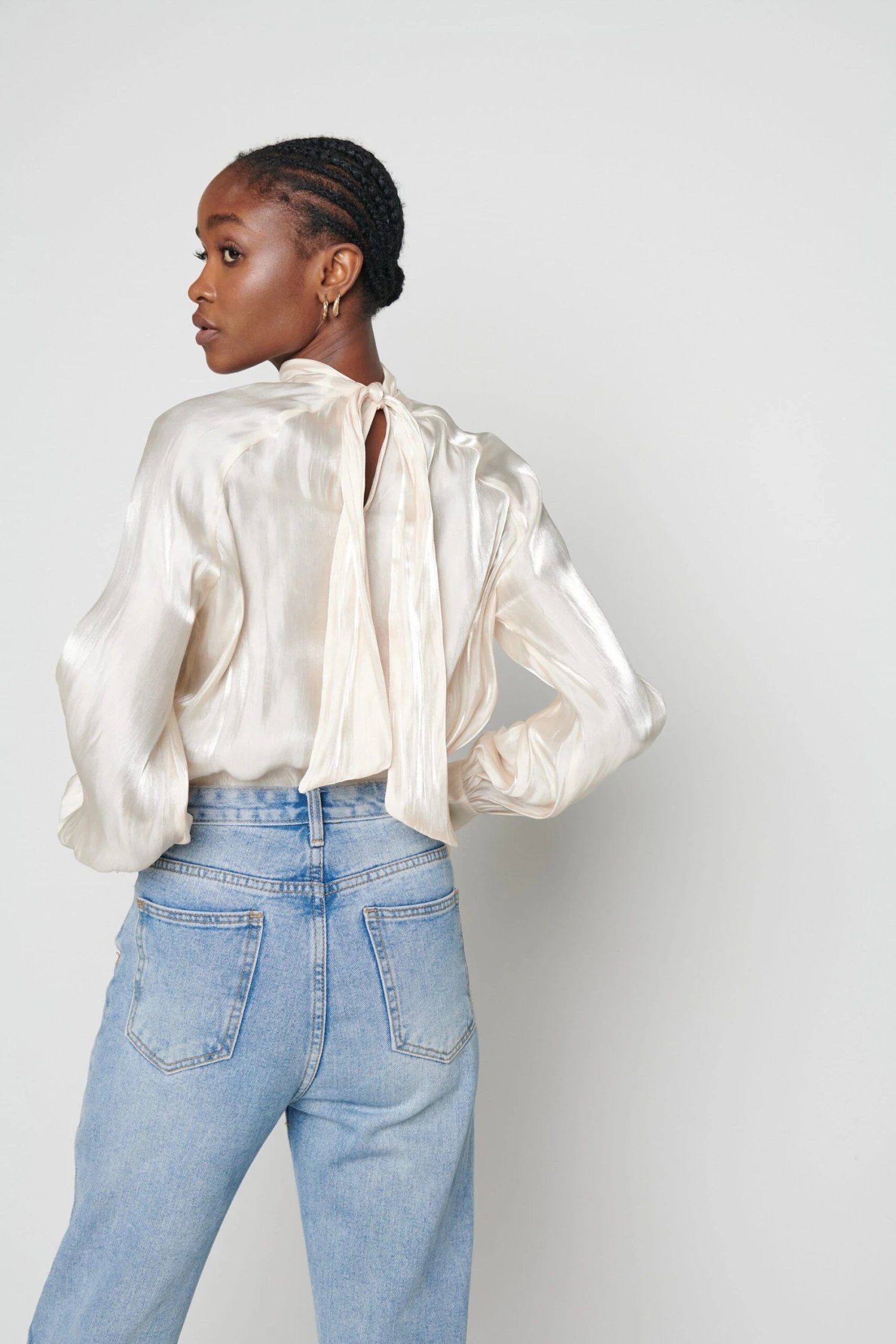Crafted from a delicate organza fabric, the Evie blouse showcases a ruched hugh neck with tie neck detail. Also detailed with an exaggerated cuff and raglan sleeve this blouse is perfect for dressing up with strappy heels and a clutch, or wearing to the office for a more relaxed look.