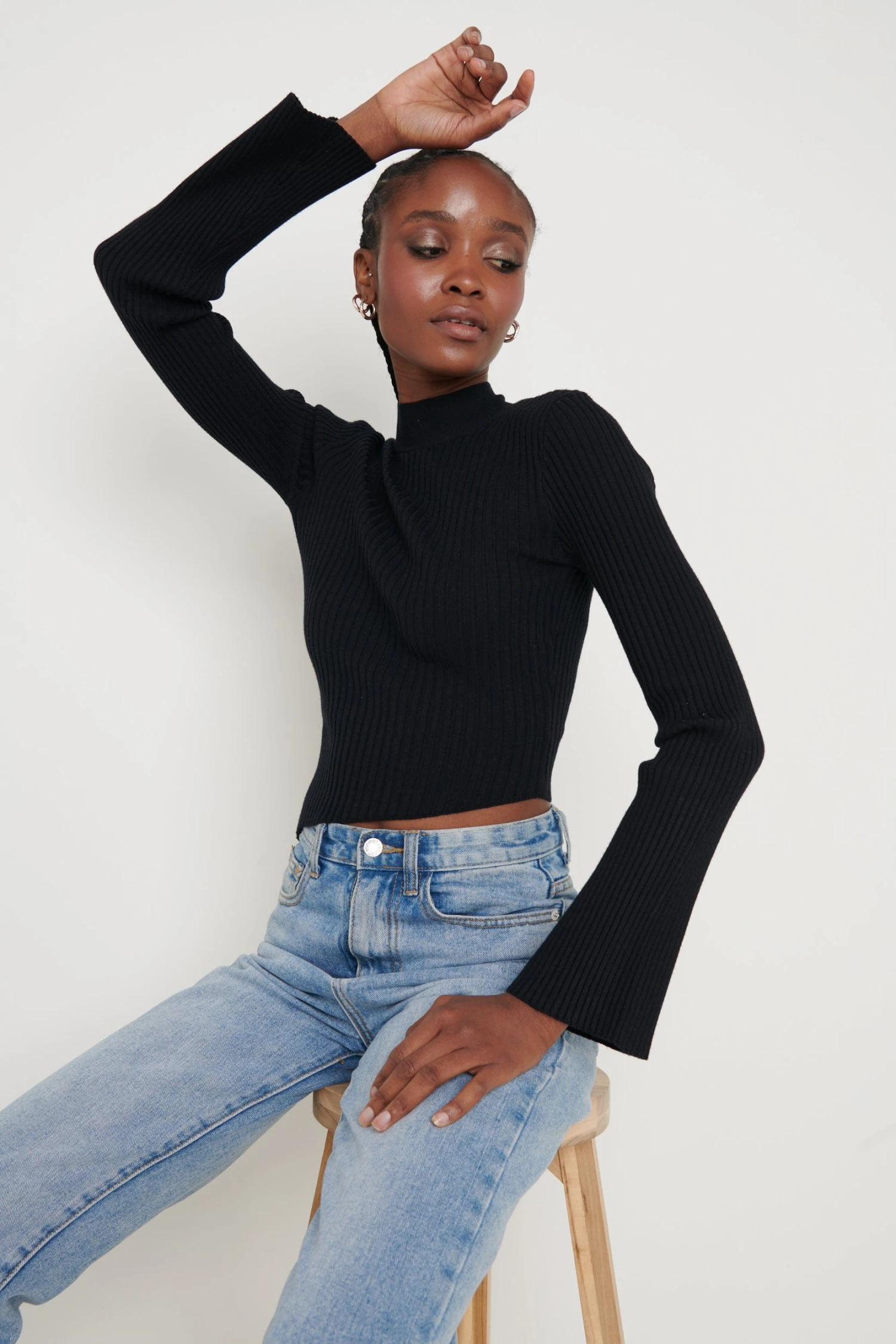 Featured from our Lazuli November December collection. A reliable wardrobe staple, our ‘Lakelyn’ backless high neck top is a piece you’ll turn to time and again. This style is cut from a lightweight knit that will make layering easy and finished with fluted cuffs. Tuck yours into jeans, tailoring, or pair with its matching skirt.