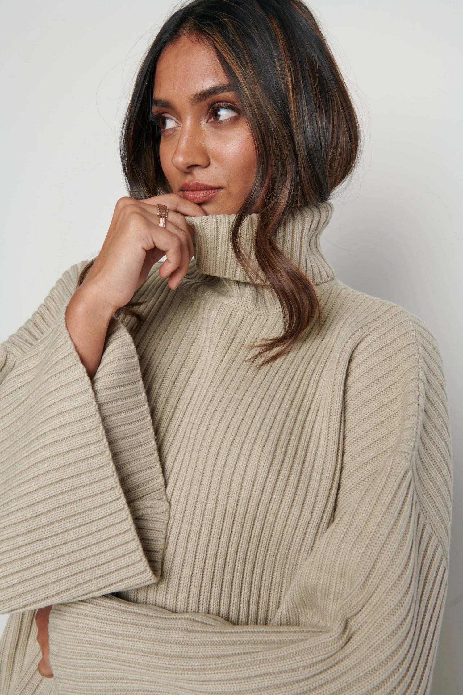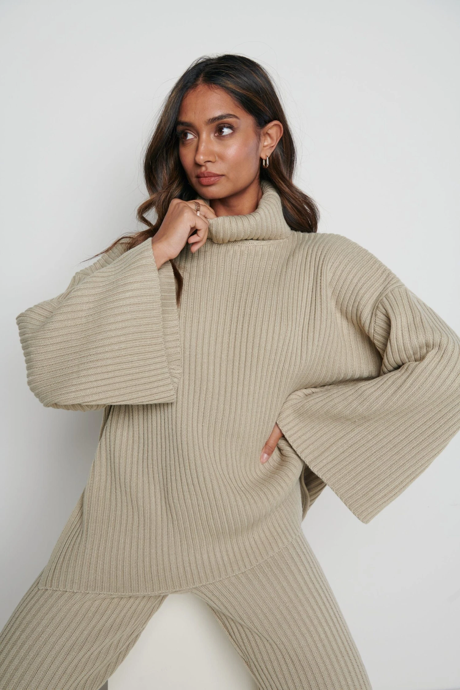 The Lina is designed in an oversized fit emphasised by deep side slits, it has an enveloping roll neck and exaggerated kimono sleeves. Wear yours with the matching Freya trousers, or solo with denim.