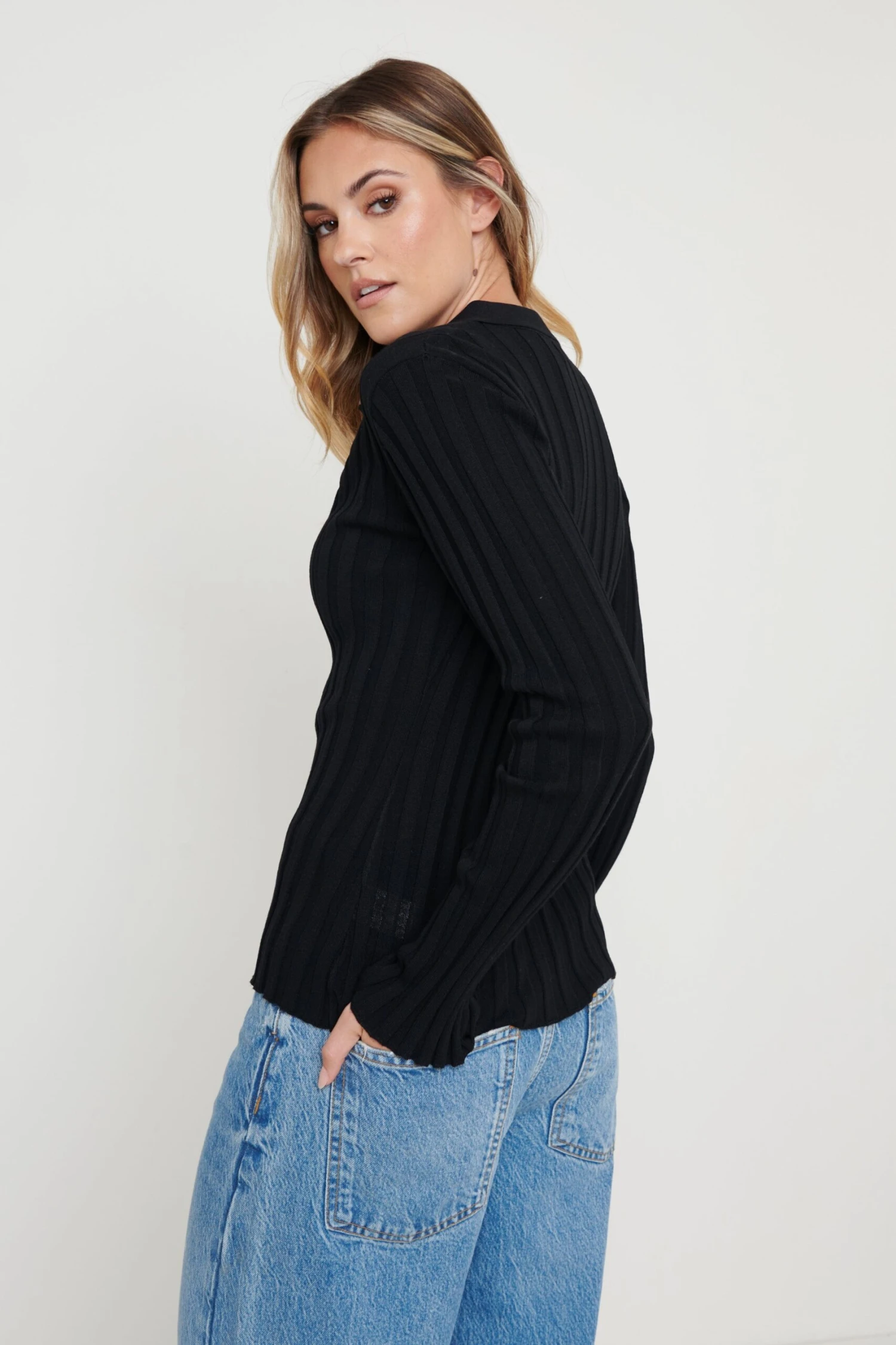 Featured from the ‘Casual Elegance’ July August collection. Curated from a figure-hugging compact ribbed knit, the button front top has a collared silhouette with a straight hem. Wear it casually with denim or dressed up with high-cut trousers.