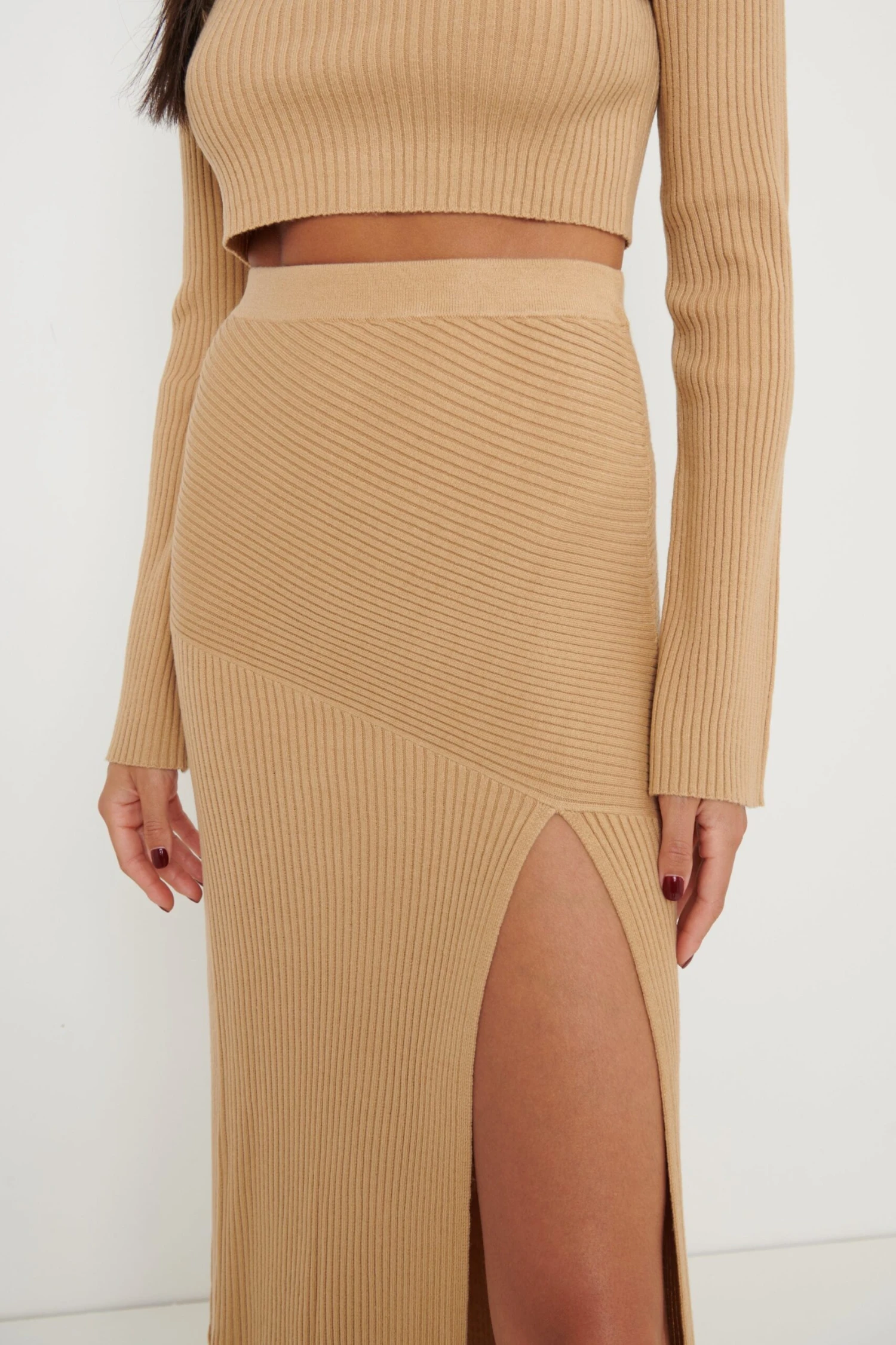 Featured from the ‘Casual Elegance’ July August collection. This set boasts a stunning minimal elevated aura for any occasion. It can take you from brunch to date night effortlessly. Style your Sofia Asymmetric Knit Skirt alone, or with it’s other piece the Sofia Long Sleeve Knit Top for the full effect.